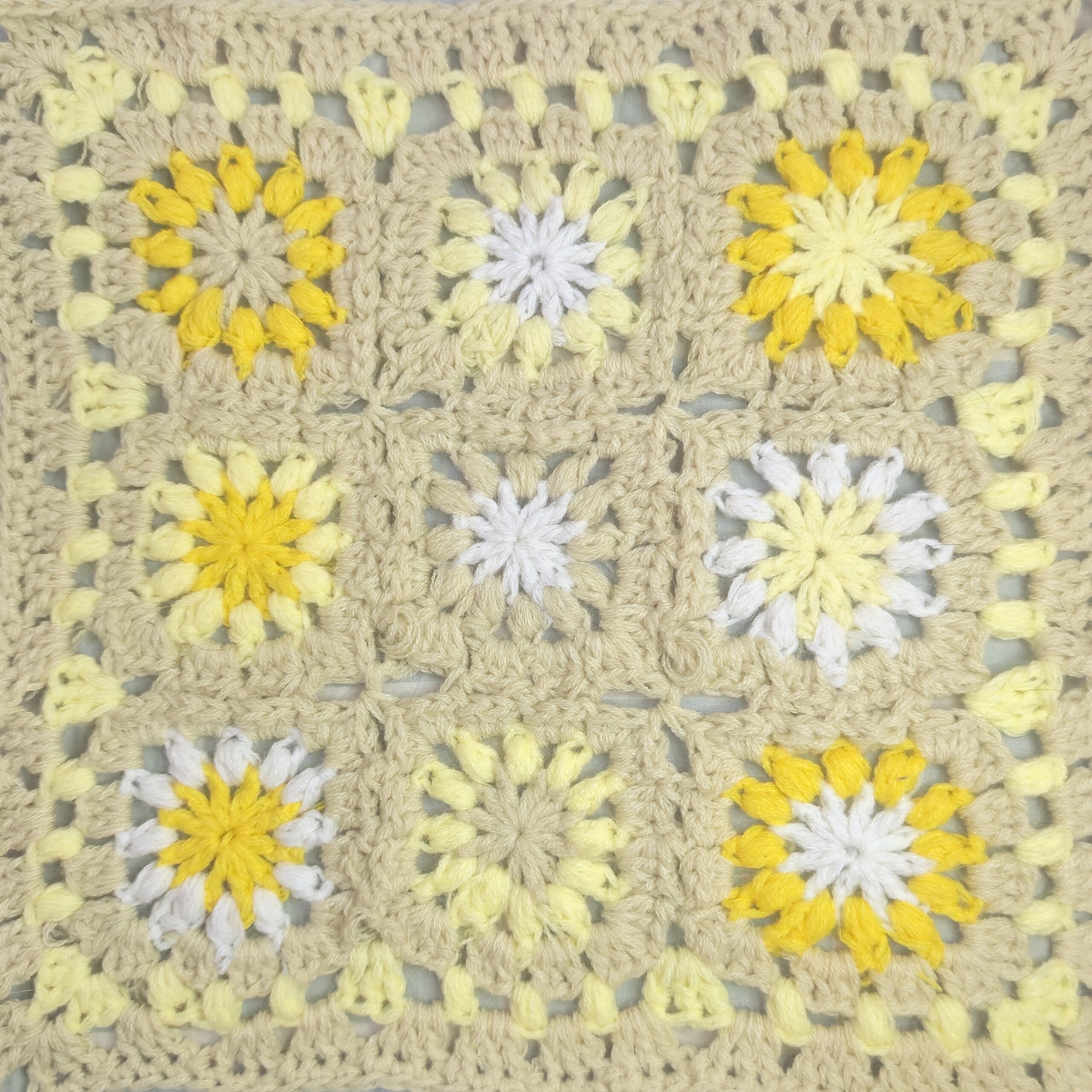 For this block, I played with different shades of yellow and a tiny bit of white Indophil yarn I had stashed from a previous project. For the border rounds, I used a light beige Indophil to tie it all together.