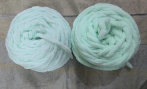 I realized my freebie stash wouldn’t be enough to handle those ruffles (they are total yarn-eaters!). I quickly ordered a 150g ball of chunky mint chenille to match, but when it arrived… it was a different shade. 😭