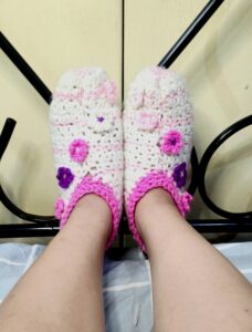 If there’s one drawback, it’s the assembly. I’d definitely categorize this as a medium-to-high sew pattern. You crochet a rectangle first, and then you have to sew to form the slipper shape, sew the ankle part, and then sew on every single flower. Just something to keep in mind if you usually try to avoid the needle! 🪡