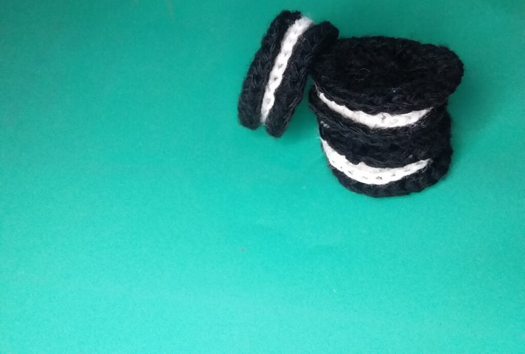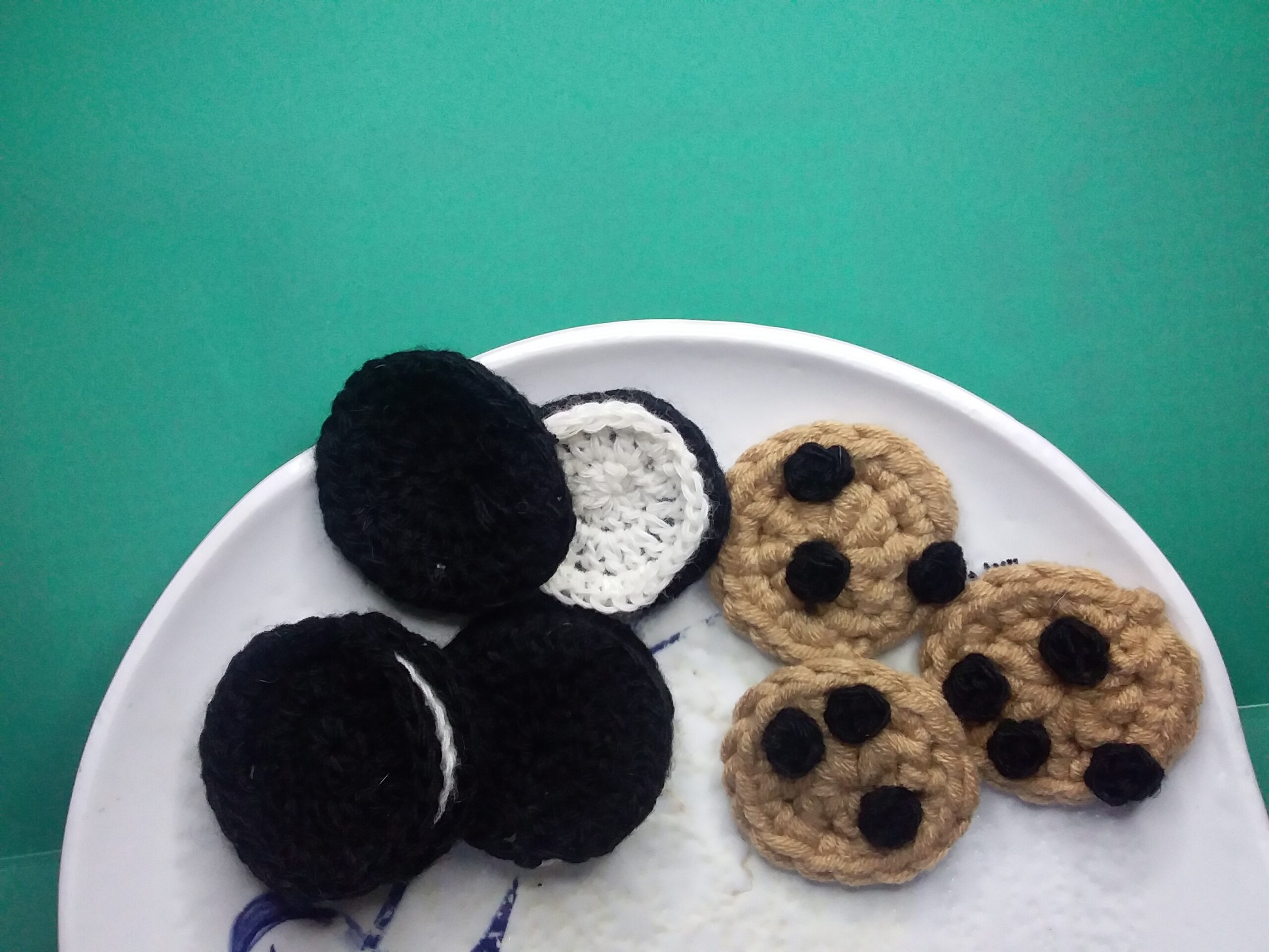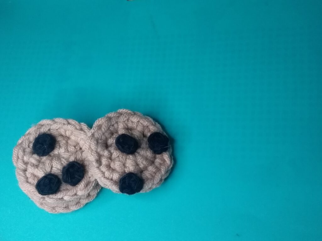 Then, for the chocolate chips, I made many small black crochets with 3.00mm hook. and I attached it to the cookie with a tapestry needle.